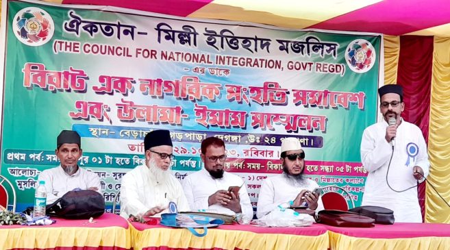বিশেষ প্রতিনিধি : উত্তর ২৪ পরগনা জেলার দেগঙ্গা বেড়াচাঁপায় ঐকতান মিল্লী ইত্তিহাদ মজলিসের ডাকে এক বিরাট কনভেনশন হয়ে গেল। রবিবার ২৯ অক্টোবর এই কনভেনশনের প্রথম পর্বে নাগরিক সংহতি সভায় বক্তব্য রাখেন সুকৃতি রঞ্জন বিশ্বাস, ছোটন দাস, ভানু সরকার, গোলাম মুর্তজা, ডাক্তার সিরাজুল ইসলাম, মাওলানা ওবাইদুর রহমান প্রমুখ।