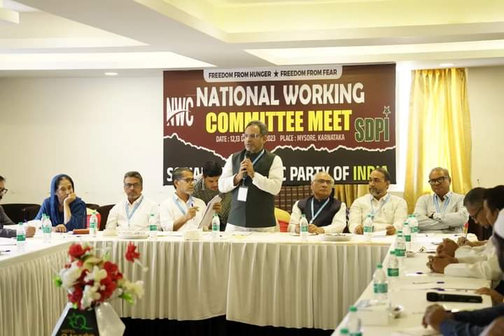মহীশূর ১৪ ডিসেম্বর: ১২ ও ১৩ ডিসেম্বর ২০২৩ মহীশূরে সোশ্যাল ডেমোক্রেটিক পার্টি অফ ইন্ডিয়ার ন্যাশনাল ওয়ার্কিং কমিটির সভা অনুষ্ঠিত হল৷ বৈঠকে বিভিন্ন আর্থ-সামাজিক সমস্যা এবং দেশের বর্তমান রাজনৈতিক পরিস্থিতি নিয়ে আলোচনা করা হয় এবং নীচে দেওয়া রেজুলেশন গৃহীত হয়েছে৷ জাতীয় সভাপতি এম.কে. ফায়জী সভায় সভাপতিত্ব করেন। জাতীয় সহ-সভাপতি অ্যাড. শরফুদ্দিন আহমেদ, বি.এম. কাম্বলে ও মোহাম্মদ শফিও বৈঠকে উপস্থিত ছিলেন। সভায় NWC র পদাধিকারী ও সদস্যরাও উপস্থিত ছিলেন এবং আলোচনায় অংশ নেন।