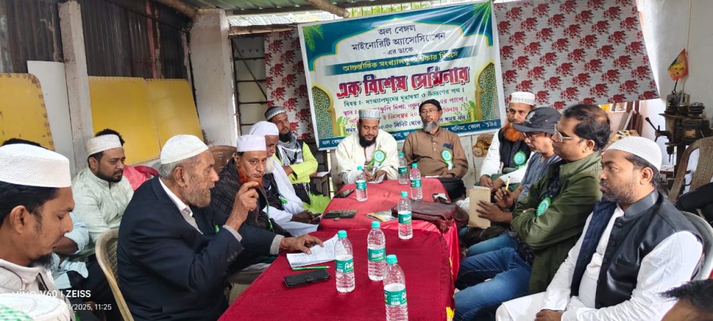বিশেষ প্রতিনিধি : হুগলির শেওড়াফুলিতে 18.12.25 বৃহস্পতিবার আন্তর্জাতিক সংখ্যালঘু অধিকার দিবস পালন করলো অলবেঙ্গল মাইনোরিটি অ্যাসোসিয়েশন।সভার সভাপতিত্ব করেন সংগঠনের সভাপতি আবু আফজাল জিন্না। “সংখ্যালঘুদের দূরাবস্থা ও উত্তরণের পথ ” এই বিষয়ের উপর এক সেমিনারের আয়োজন করা হয়েছিল। বিভিন্ন সংগঠনের ও সমাজকর্মী মানুষজন উপস্থিত হয়ে বক্তব্য রাখেন।মৌলানা ইসাহক,বাওজুল হোসেন, আজিজুল হক, বন্ধুর হাত সংস্থার সর্পমিত্র অরিন্দম চক্রবর্তী মৌলানা আনোয়ার শাহ জামাতি ইসলাম হিন্দের হুগলি জেলার নাজিম সৈয়দ সাইফুল্লাহ সাহেব ইমাম সংগঠনের রফিকুল ইসলাম আরো অনেকে।বক্তাদের বক্তব্যে উঠে আসে, বর্তমান সময়ে সংখ্যালঘুদের রাবার স্ট্যাম্প রুপে ব্যবহার করছে রাজনৈতিক দলগুলো।ও বি সি নিয়ে ছিনিমিনি খেলা হচ্ছে সাধারণ মানুষদের।সাচার কমিশনের রিপোর্ট ও রঙ্গনাথ মিশ্র কমিশনের রিপোর্ট, কুন্ডু কমিশনের রিপোর্ট মান্যতা দেওয়ার জন্য বলিষ্ঠ ভূমিকা পালন করা দরকার, সরকার তা করছেনা।